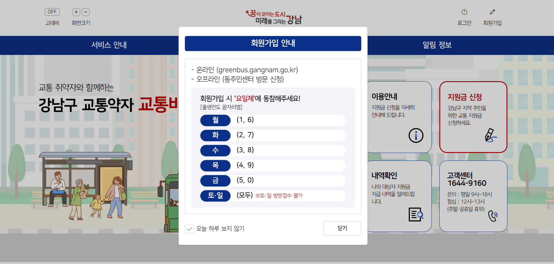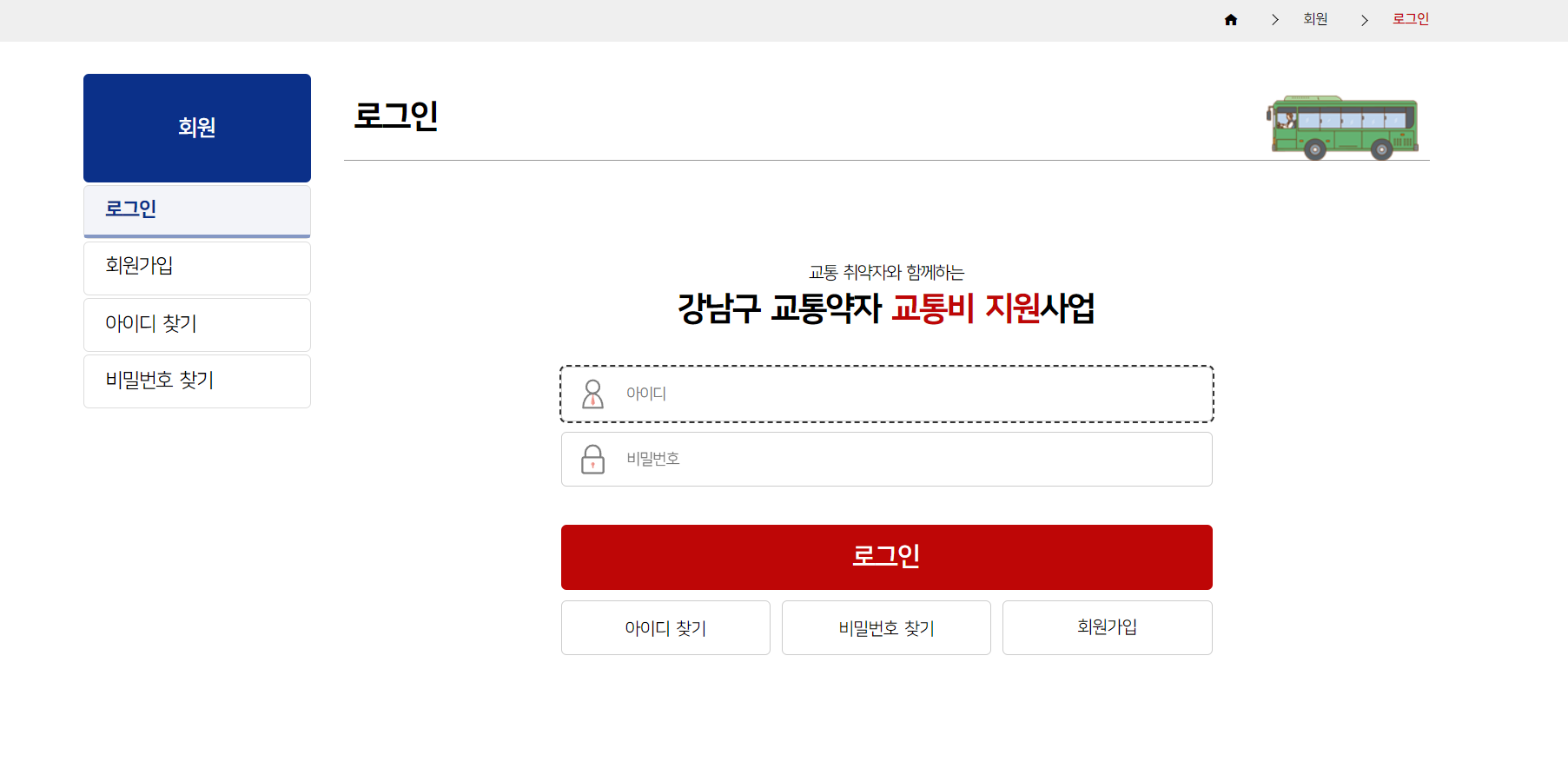 강남구 교통약자 교통비 지원 홈페이지에 접속하여 회원가입을 합니다.