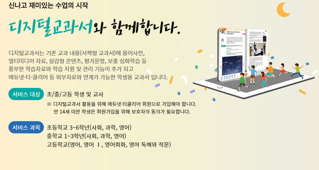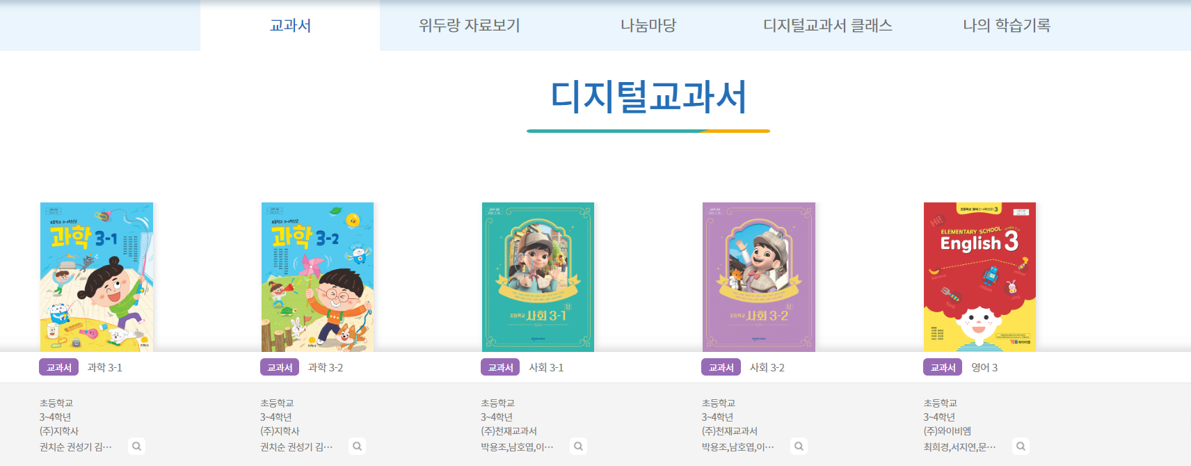 공지사항에서도 언급이 되어 있었듯 디지털 교과서는 초등학교 3학년 부터 고등학교까지 제공됩니다.