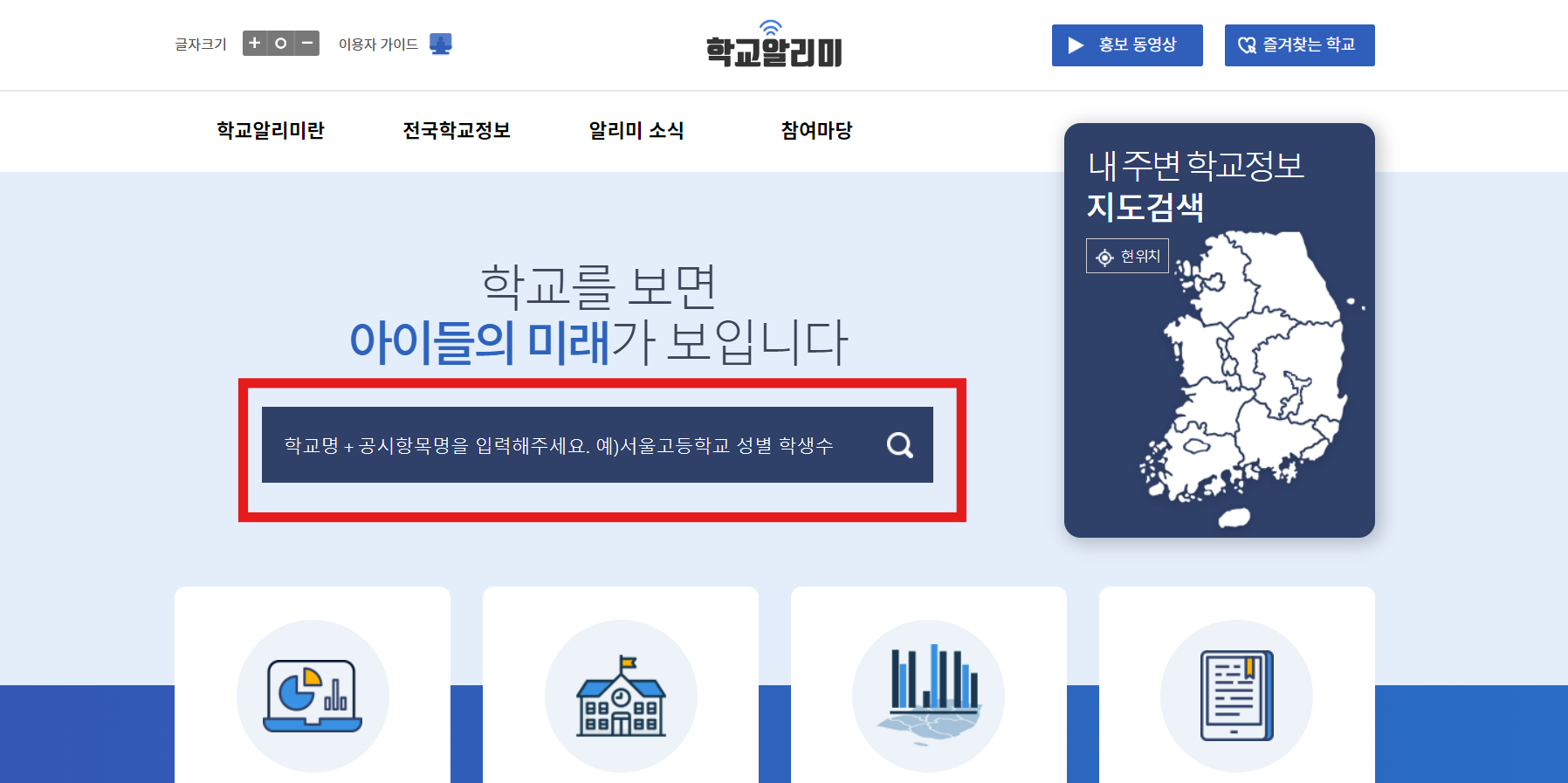 학교의 학생수와 교원 수 등의 정보가 궁금하신 학부모와 학생들은 학교알리미를 통해 원하는 정보를 실시간으로 확인하고, 그에 따라 변화하는 교육 환경에 대비해 보세요.