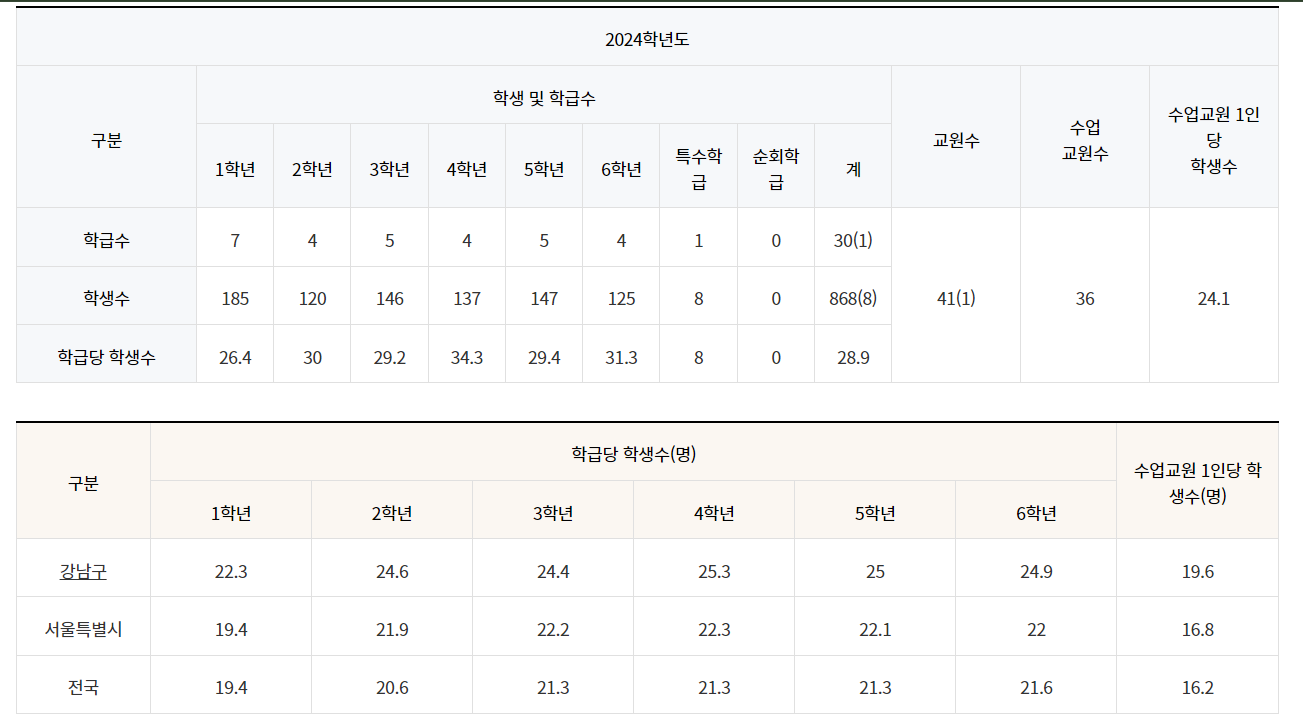뿐만 아니라 학교별 공시정보에 들어가보면 위에 보이는 것 처럼 학년별로도 학생수와 학생수가 정리되어 있으며, 학급당 학생수는 서울시 평균, 구평균, 전국 평균까지 한 눈에 볼 수 있습니다.