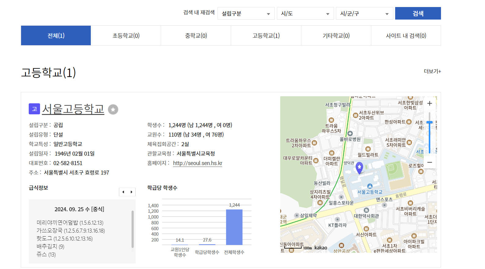 그러면 이렇게 성별에 따른 학생수, 교원수 뿐 아니라 급식 정보, 학급당 학생수와 홈페이지 링크까지 모두 한 눈에 확인할 수 있습니다.