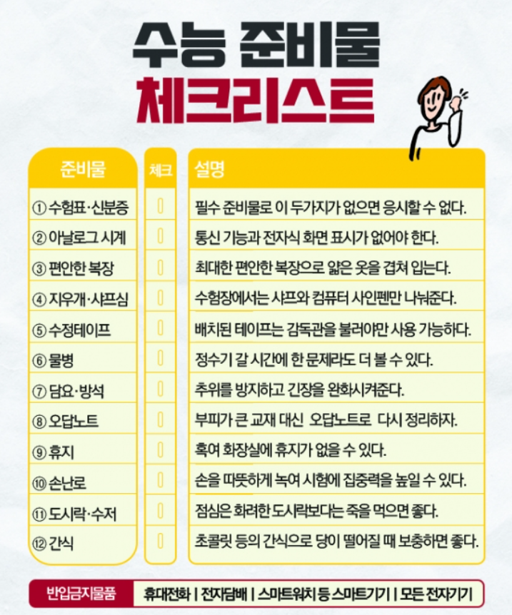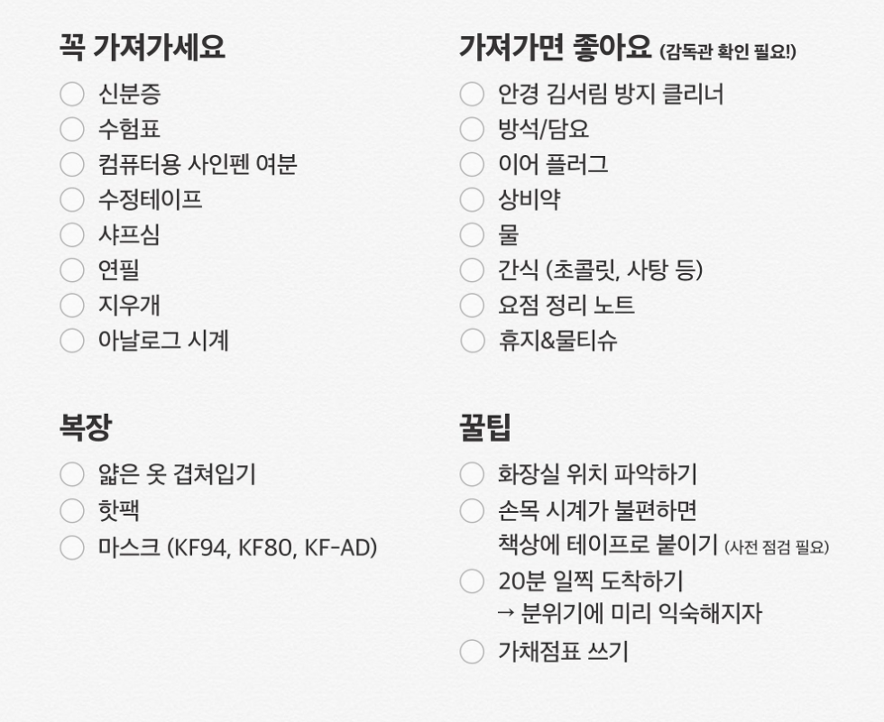 아래의 체크리스트를 활용하면 시험 당일에 더 차분하게 준비할 수 있을 거예요.