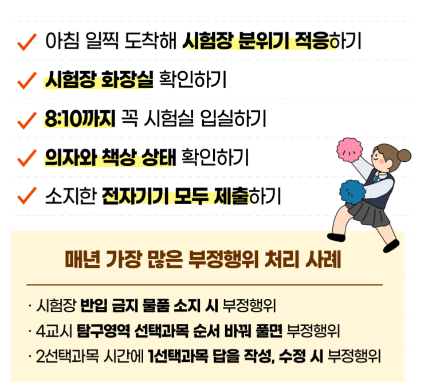 시험 당일에는 여유 있게 도착해서 시험장 분위기에 익숙해지는 게 좋아요. 화장실도 미리 확인해 두고요. 반드시 8:10까지는 도착해야 합니다. 소지한 전자기기가 있다면 미리 제출하고요.