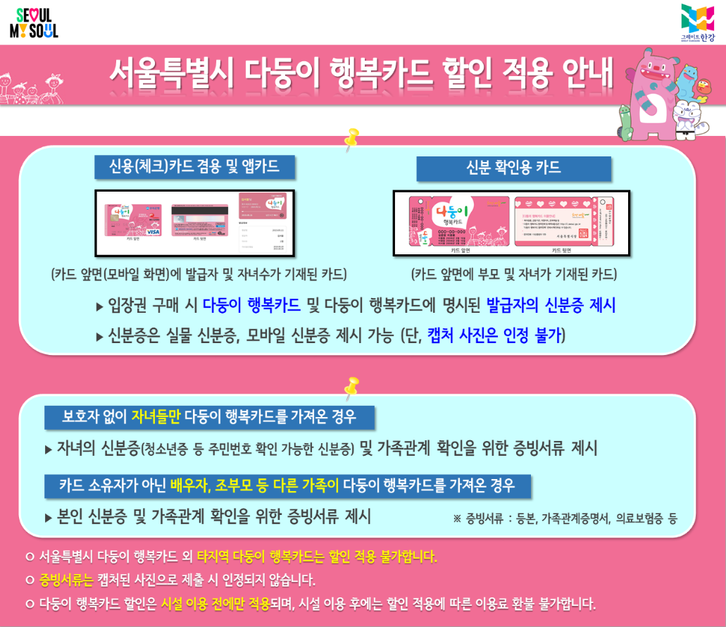 - 50% 할인: 다둥이행복카드 가족, 65세 이상, 장애인(1~3급) + 보호자 1명, 국가유공자 (신분증 및 증명서 필수)