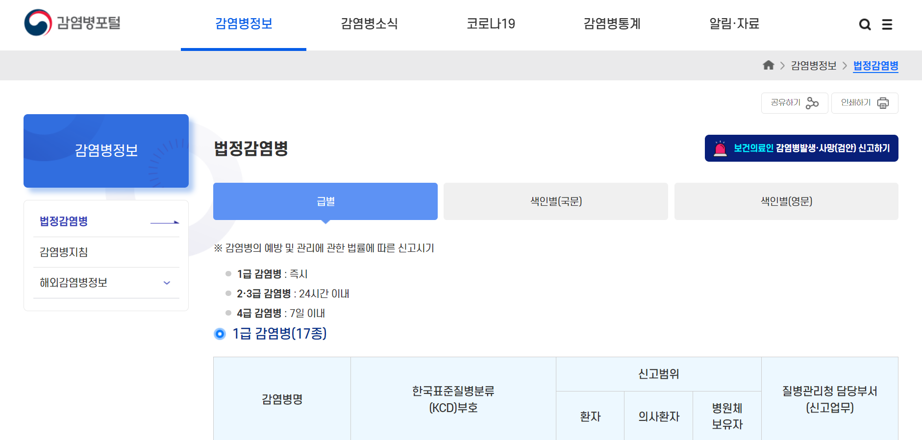 사이트에는 이 병들 외에 다른 법정 감염병에 대해서도 급별로 정리되어 있습니다. 각 병에 대해 예방법, 치료방법, 신고방법 등의 정보도 있으니 자세한 사항 알고 싶으시면 들어가서 확인해 보시기 바랍니다.