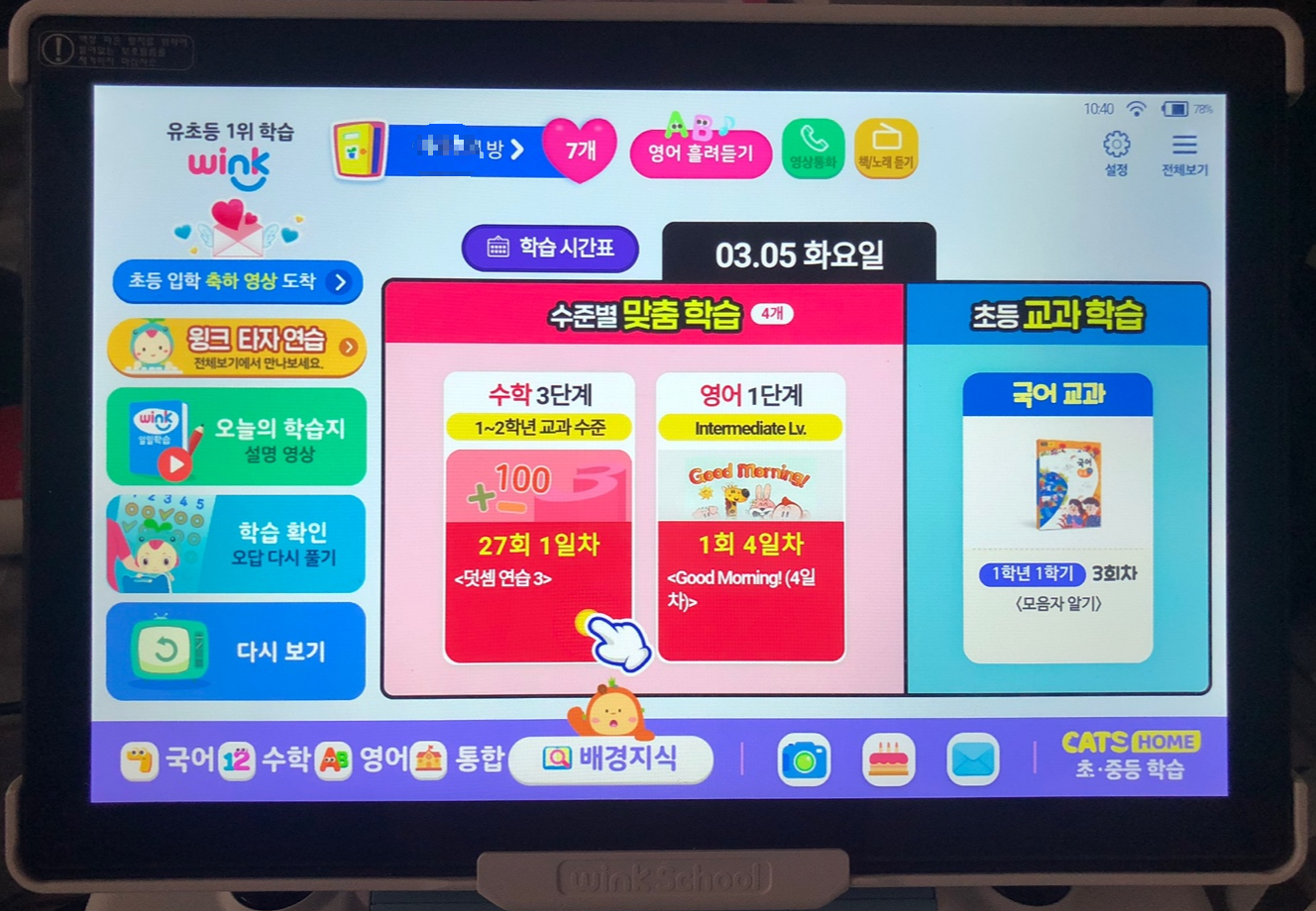 그리고 터치펜이 있었으면 좋겠는데 윙크는 없다. 굳이 필요없다고 생각하는 사람들도 있겠지만 기왕에 학습기를 사용하기로 했다면 펜을 잡고 써보기도 하고, 터치해 보는 재미를 느껴보는 것도 좋을 것 같다.