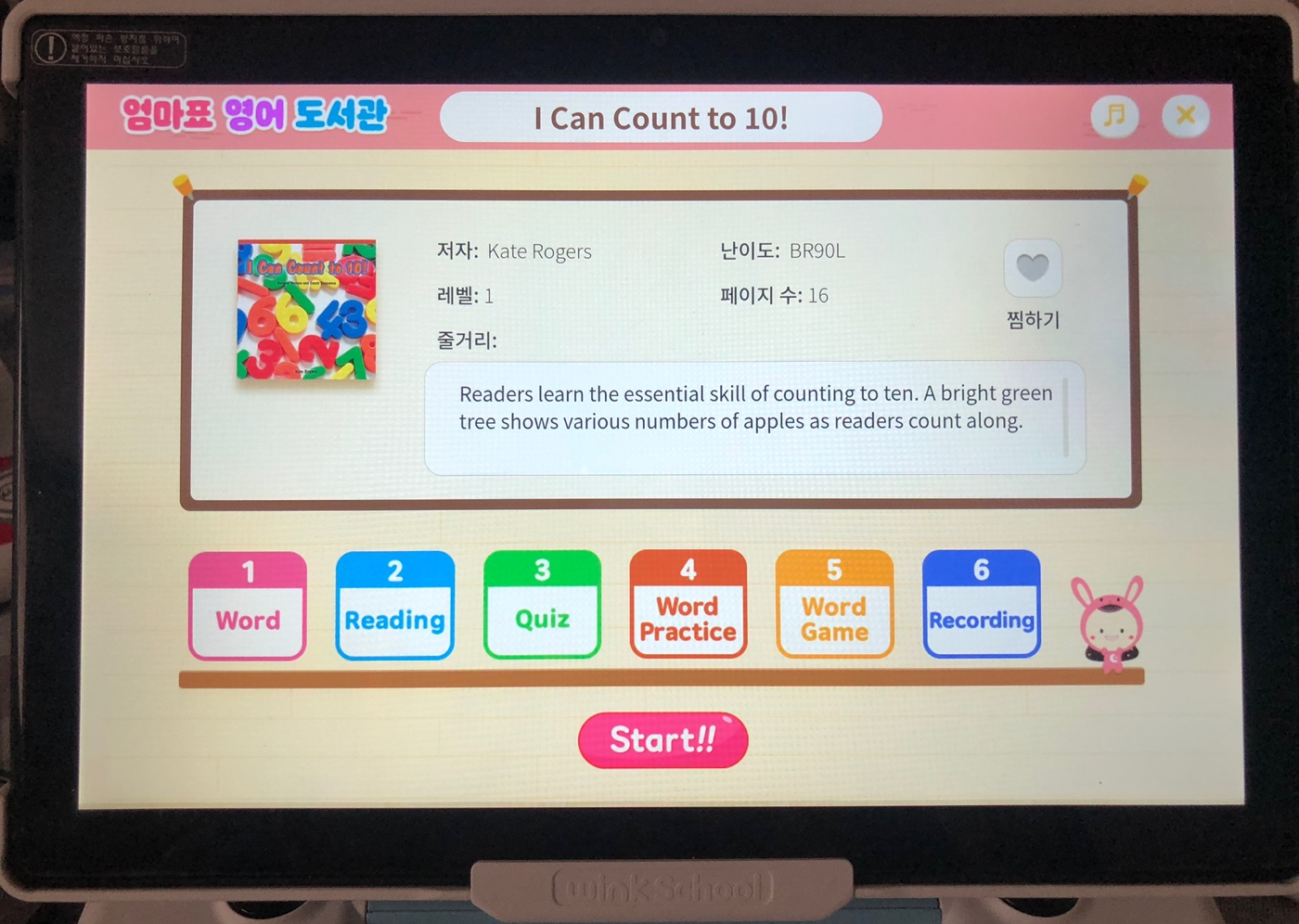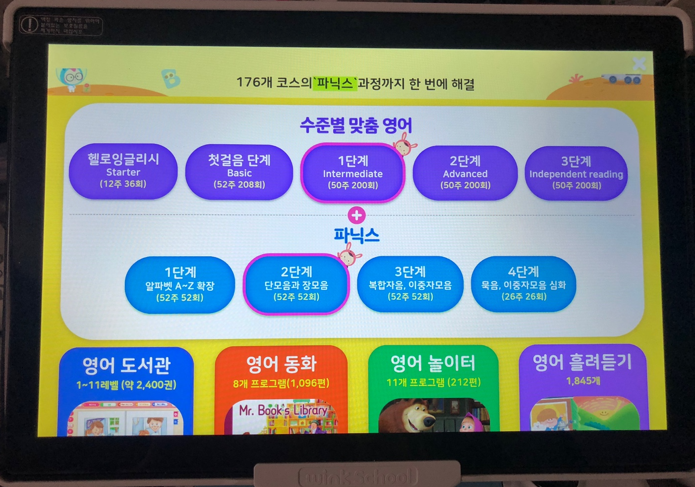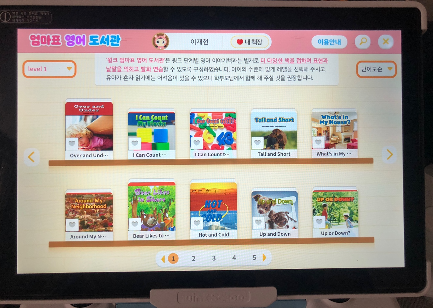 무엇보다도 윙크와 다른 학습기와의 차별점이라면 진도에 맞는 지면 학습지가 제공된다는 점이다. 그리고 실물 도서를 대여해 주고 전문가와 1:1 수업을 제공해 준다는 점도 좋다. 개인적으로 영어의 경우 실물 책이 제공되며 지면 그대로의 내용을 화면에 보여주며 읽어주기도 한다는 점도 마음에 든다. 그러나 회원 가입 시, 새로운 패드를 제공하는 것이 아니라 체험 때 사용 했던 패드를 사용해야 하며 계약 종료 시 다시 반납해야 한다는 점은 아쉽게 느껴진다.