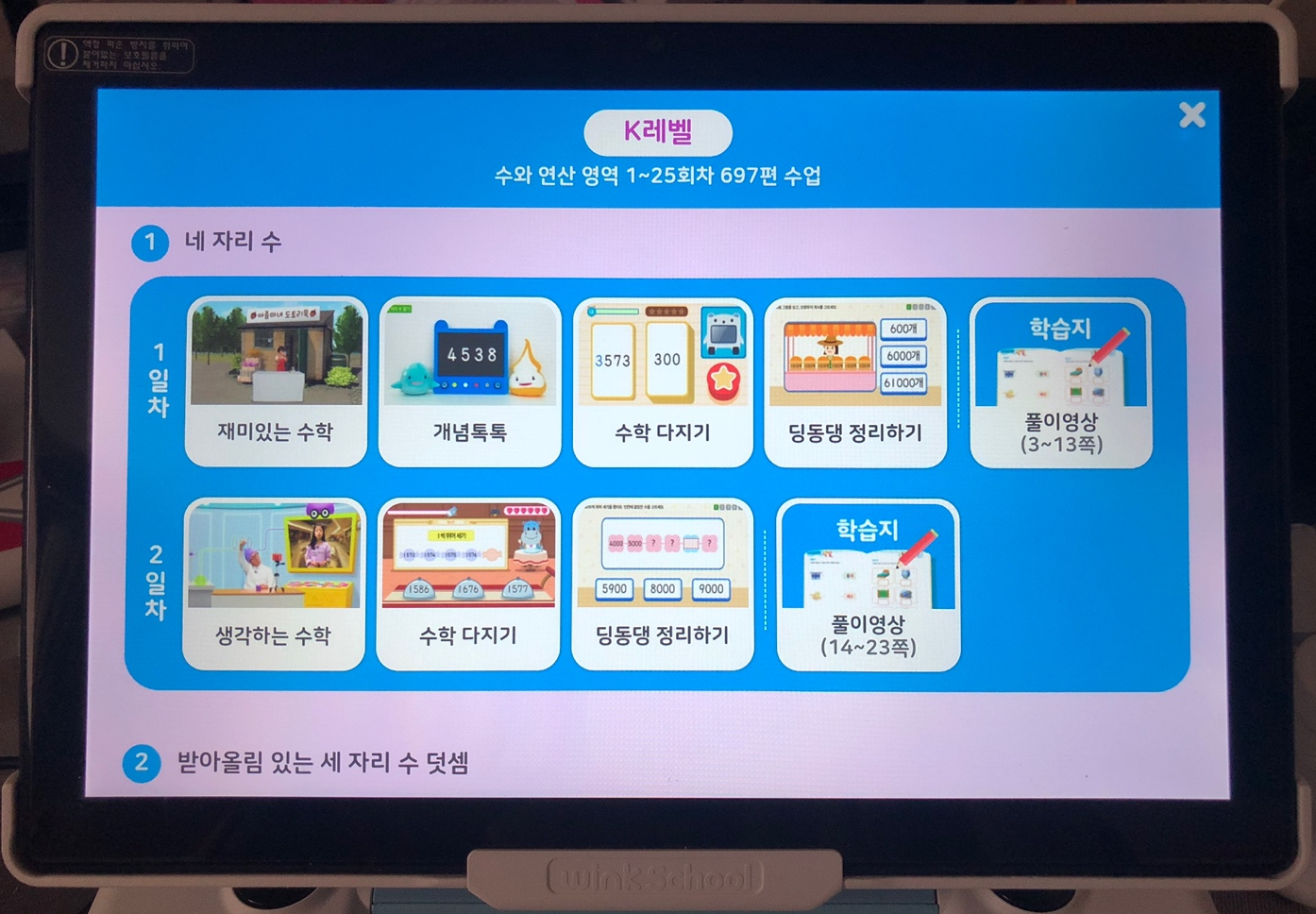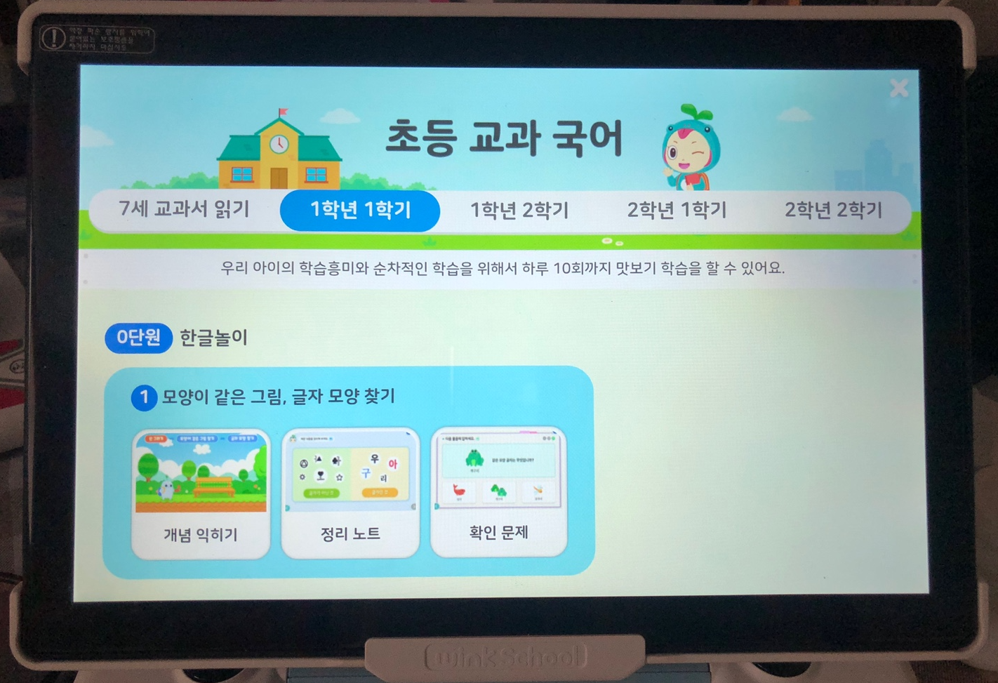 아이가 책으로만 통해서만 학습하는 것보다 때로는 미디어를 통해 학습하면 관심을 가지고 받아들이는 속도가 빠를 때가 있다는 것을 보고 나니 정기적으로 학습기를 시켜보면 어떨까라는 생각이 들었다. 그러던 와중에 윙크는 1, 2학년 교과서 중심으로 차근차근 학습해 나갈 수 있다는 점과 패드 학습기와 지면 학습지가 연계되어 있다는 점에 관심을 가지고 체험 신청해 보았다.