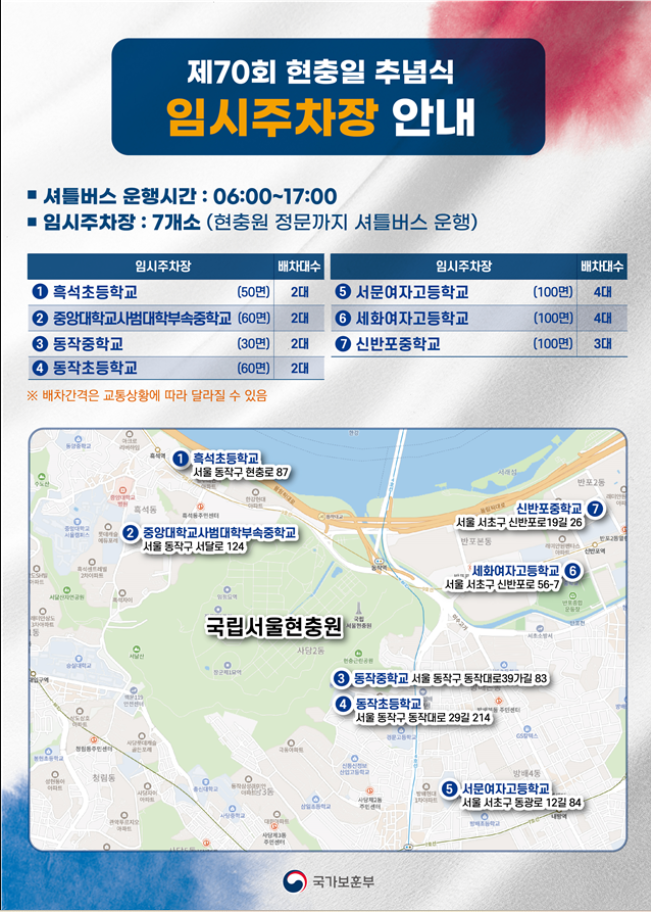 🚗 주차정보: 현충일 당일에는 현충원 내 차량 진입이 불가합니다. 대신 주변 학교들을 이용해 7개의 임시주차장을 운영할 예정입니다. 아래 참고하셔서 임시 주차장 위치를 미리 확인하시기 바랍니다.