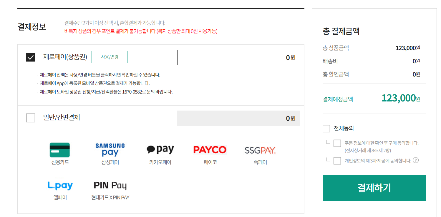 입학준비금을 사용하여 온라인몰에서 상품을 결제하게 된다면, 결제정보 창에서 제로페이(상품권)을 선택하여 사용/변경을 클릭하여 후의 절차를 따르면 됩니다.