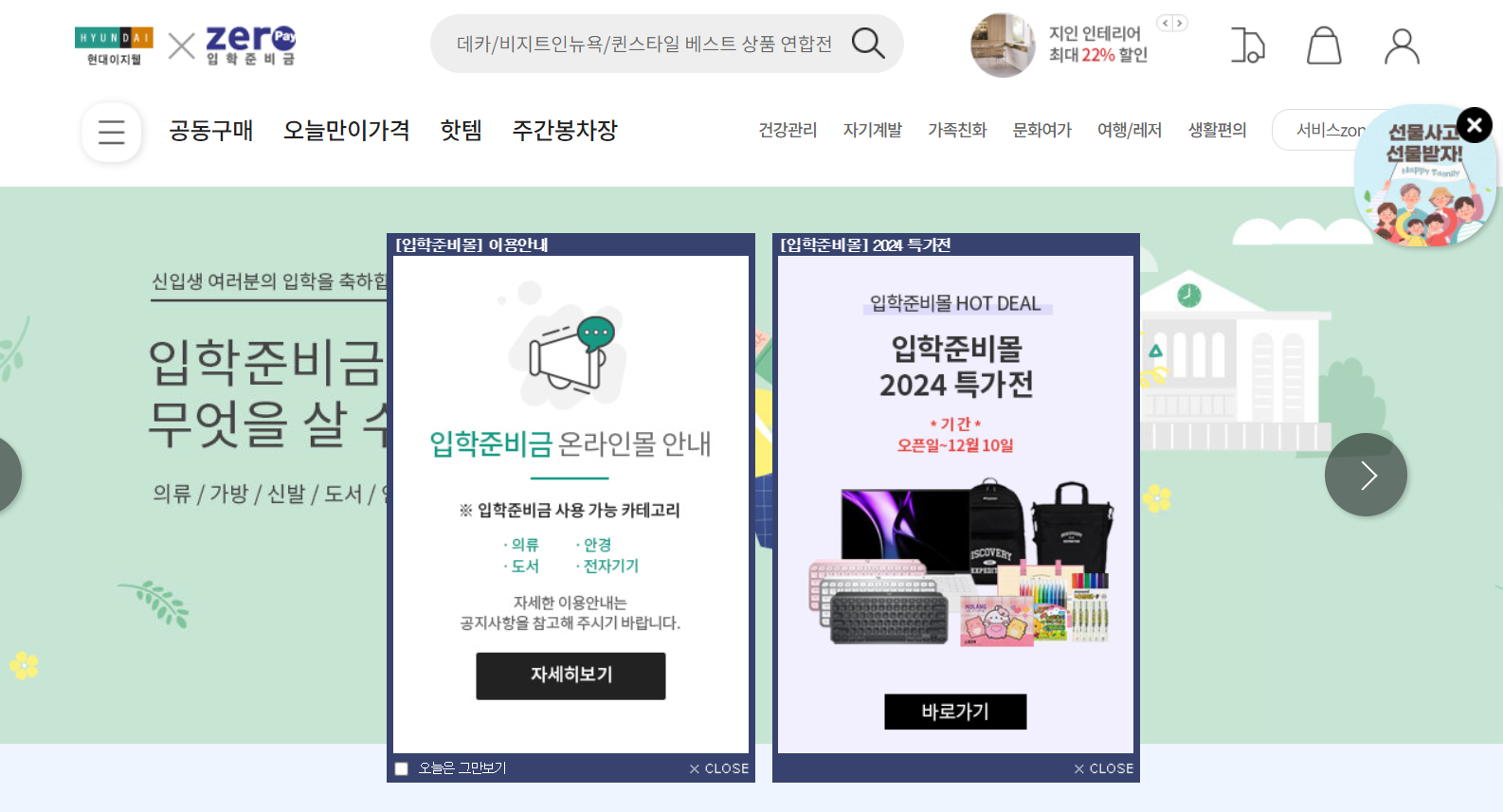 회원가입을 거쳐 로그인을 하면, 온라인몰에 대한 간단한 소개와 더불어 입학준비몰 특가전이라는 창이 뜨는데요.