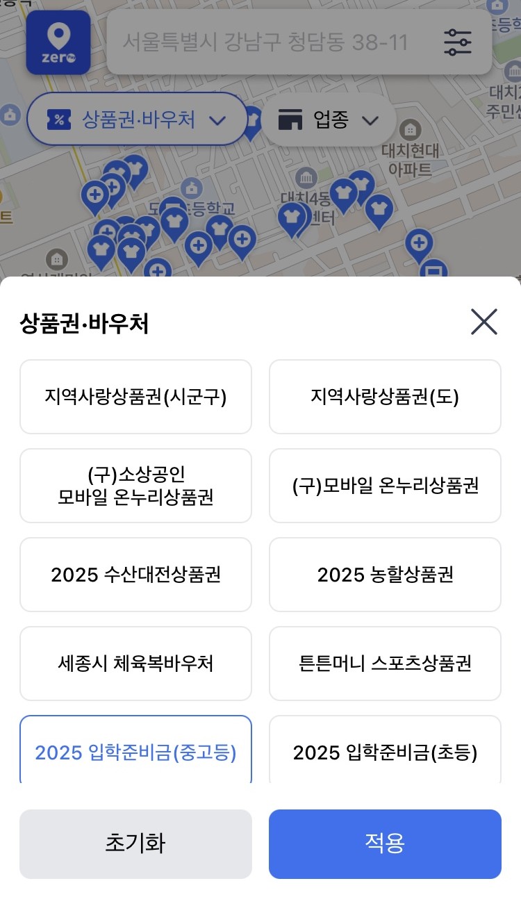 3. 아랫줄에 보이는 2024 입학준비금(초등 또는 중고등)을 클릭하면, 지도에서 지원받은 입학준비금을 이용할 수 있는 매장들이 표시됩니다.