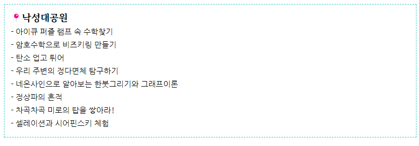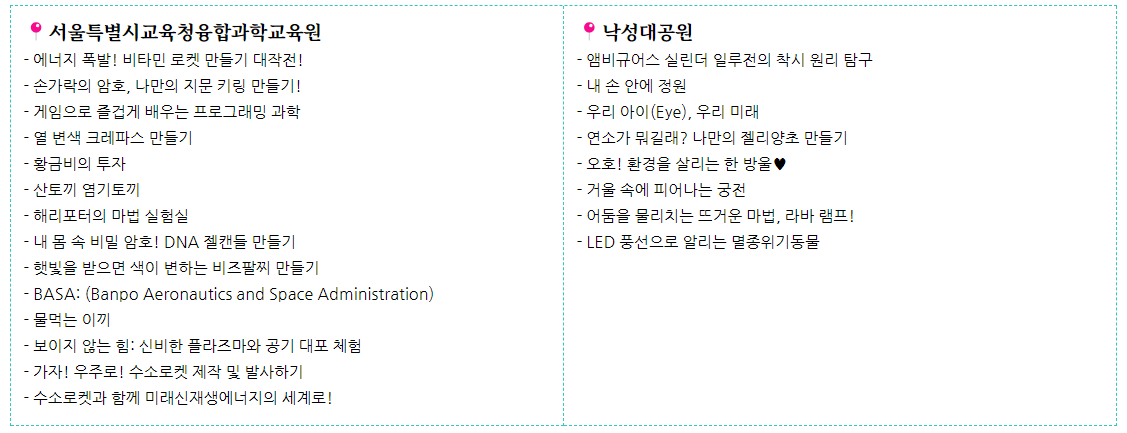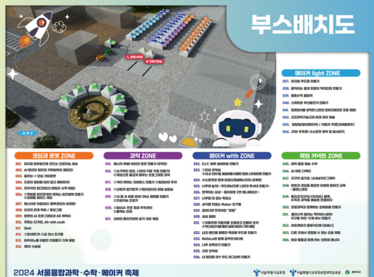 - 체험 부스 : 다양한 과학 실험과 수학 게임을 통해 직접 체험할 수 있는 부스가 마련됩니다.