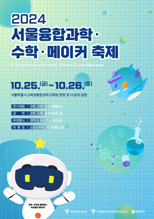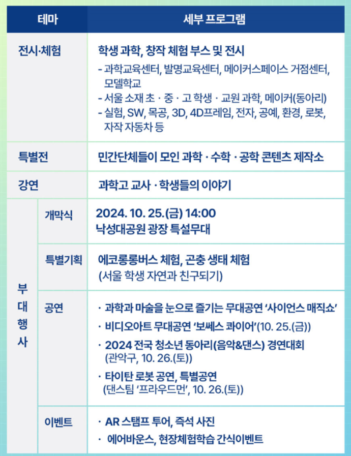 2024 서울 융합과학·수학·메이커 축제에 대해 소개하겠습니다. 이번 축제는 서울특별시교육청융합과학교육원 본원과 낙성대 공원 일대에서 2024년 10월 25일부터 26일까지 이틀간 진행됩니다. 🎉