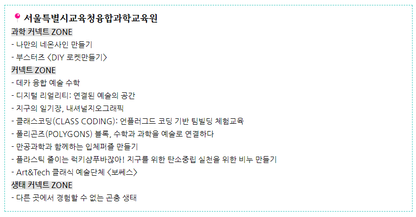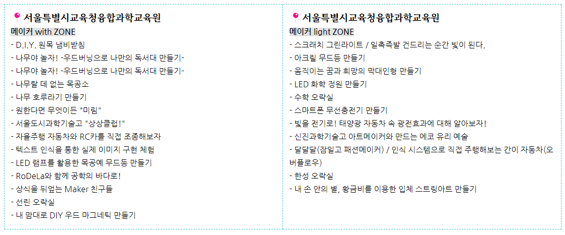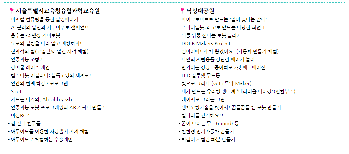- 메이커 활동 : 창의적인 아이디어를 실현할 수 있는 메이커 공간이 마련되어, 참가자들이 직접 만들고 체험할 수 있습니다.