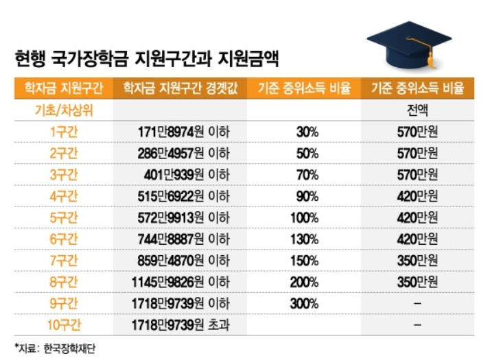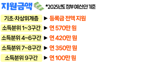 2025년도 정부 예산안을 기준으로 하여 지원여부를 확인할 수 있습니다. 다양한 소득 구간에 따라 차등지급 되는데 2025년 1학기부터는 학자금 지원 구간이 9구간까지 확대됩니다. 소득 구간이 높을 수록 높은 소득에 해당이 되는 것인데, 기존에는 8구간 이하의 학생들이 받을 수 있었던 혜택을 더 많은 학생들이 받을 수 있게 된 것입니다.