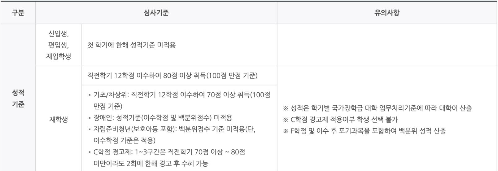 재학생이라면 직전학기 12학점 이수하여 80점 이상 취득해야 합니다. 보다 세부적인 사항에 대해서는 아래 참고하세요.