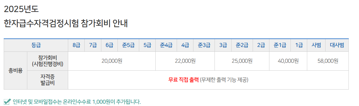 응시료는 8급에서 5급까지가 20,000원이며, 준 4급에서 준 3급이 22,000원, 3급에서 2급이 25,000원, 준 1급에서 1급이 40,000원입니다. 대부분은 현장접수보다 인터넷이나 모바일 접수를 할 텐데요. 그럴 경우, 1,000원 더 추가된 금액을 지불하게 됩니다.