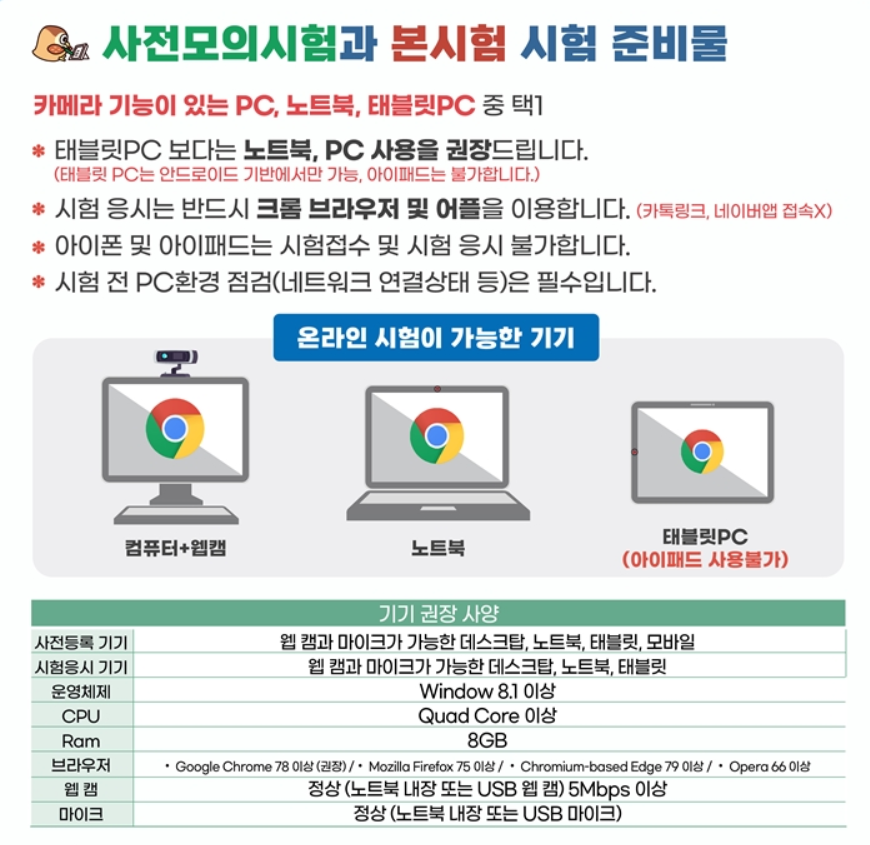 온라인 자기주도 시험의 경우, 응시가능한 환경과 조건을 가지고 있는지에 대해서도 사전점검 하시고 신청하시는 게 좋습니다. 가지고 있는 노트북이나 PC에 웹캠과 마이크가 있는지 체크하셔야 하고요. 반드시 시험응시할 때는 크롬 브라우저를 이용해야 합니다.