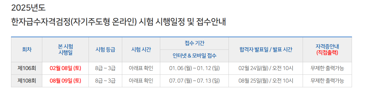 자기 주도형 온라인 시험의 경우, 2025년에 2번 시행됩니다. 첫 시험이 2월 8일(토), 두 번째 시험은 8월 9일(토)이네요.