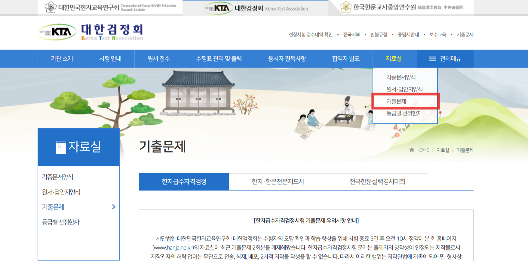 홈페이지에는 최근 2회분의 기출문제를 배포하고 있습니다. 자료실의 기출문제를 클릭해 보시면 확인하실 수 있습니다.