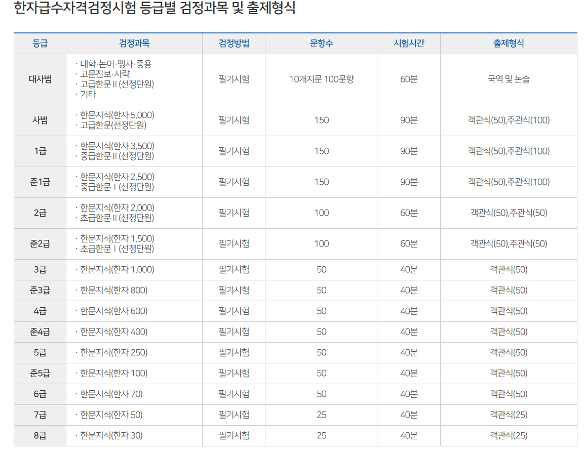 8급부터 3급까지는 객관식 문학으로 구성되며, 준 2급부터 주관식 문제가 포함됩니다. 급수별로 상이한 문항수와 시험시간에 대해서는 아래의 표 참고해 보세요.