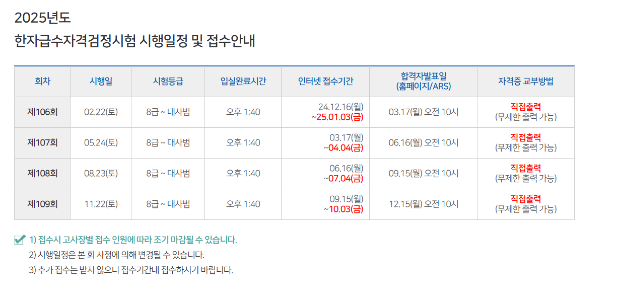 현장시험의 경우, 2025년도에 제106회 2월 22일(토) 시험을 시작으로 4번 시행됩니다. 아래 일정표 확인해 보세요.