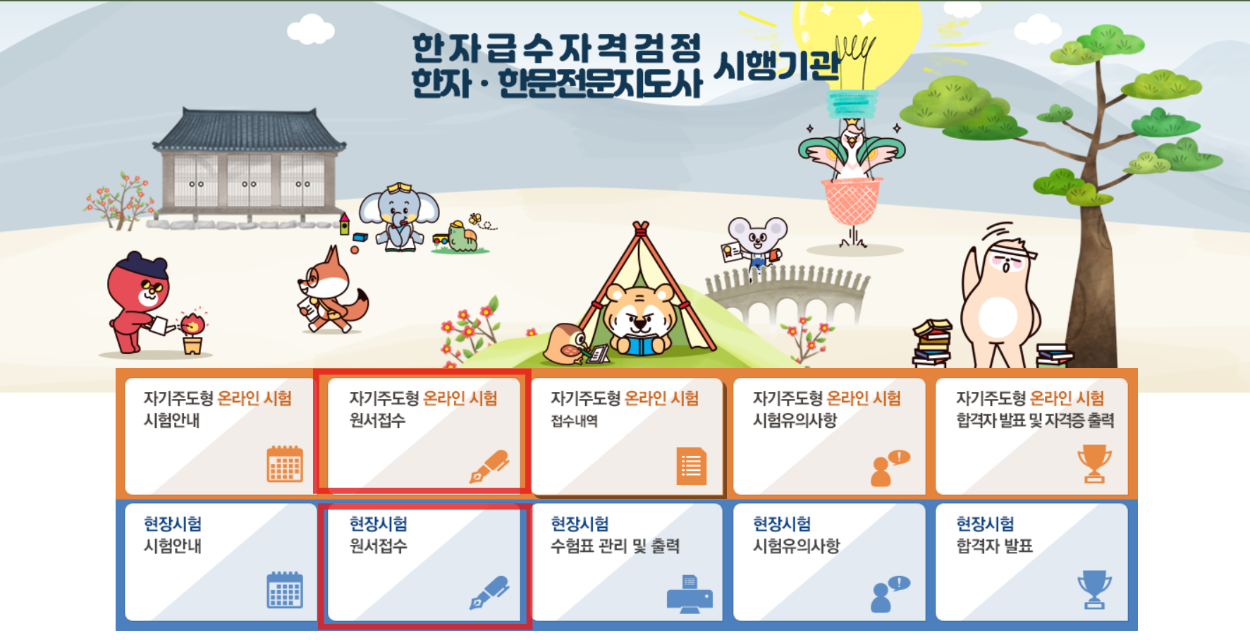 대한검정회 한자시험은 현장시험과 자기 주도형 온라인 시험으로 나뉩니다. 직접 시험장에 가서 보는 시험이 현장시험이고, 온라인 시험은 집에서 캠이 달린 컴퓨터나 태블릿으로 보는 시험입니다.