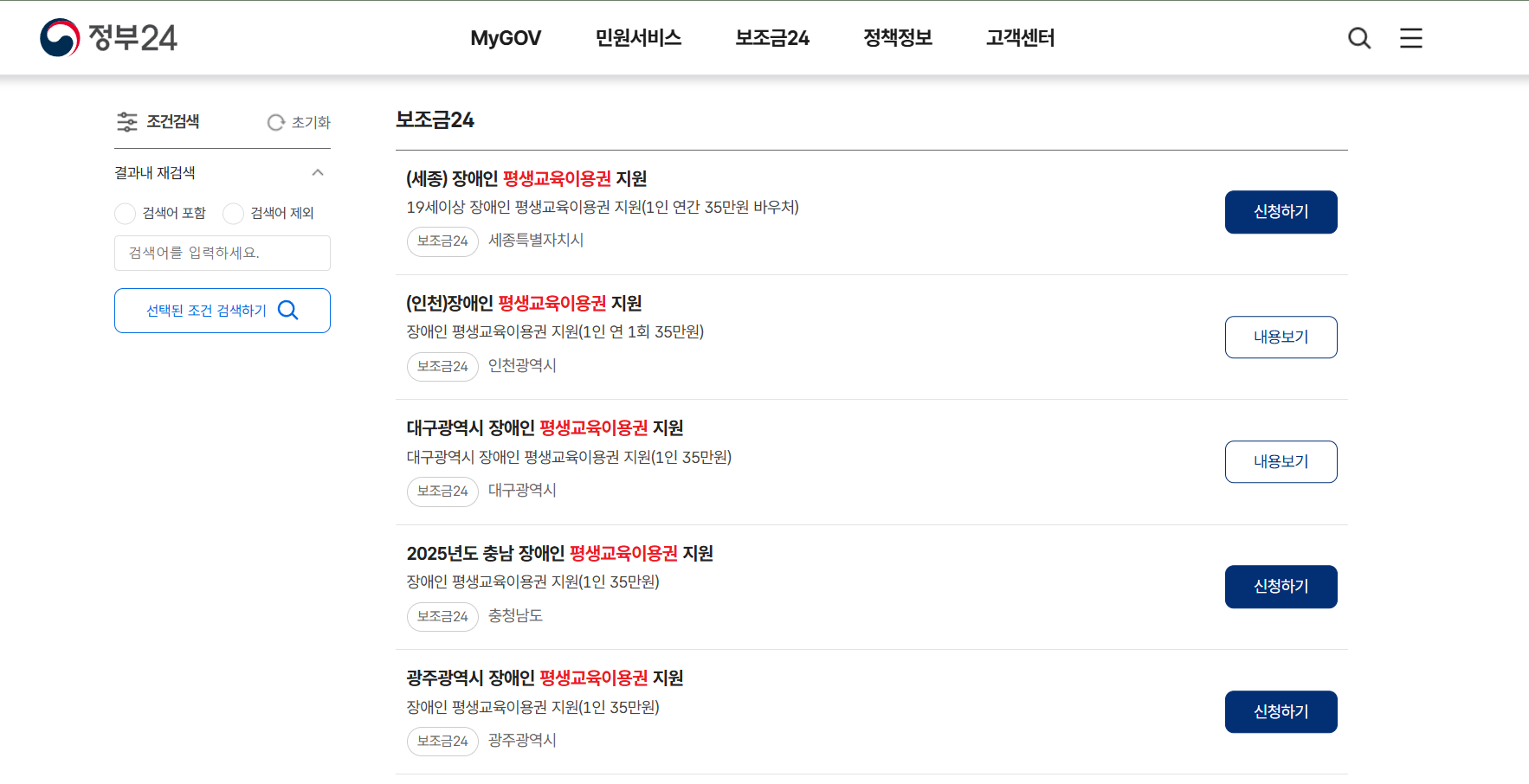 장애인 이용권 신청자의 경우, 정부 24로 가셔서 검색창에 '평생교육이용권'을 치셔서 클릭하시고, 해당 지역의 '신청하기'를 클릭하시면 됩니다.