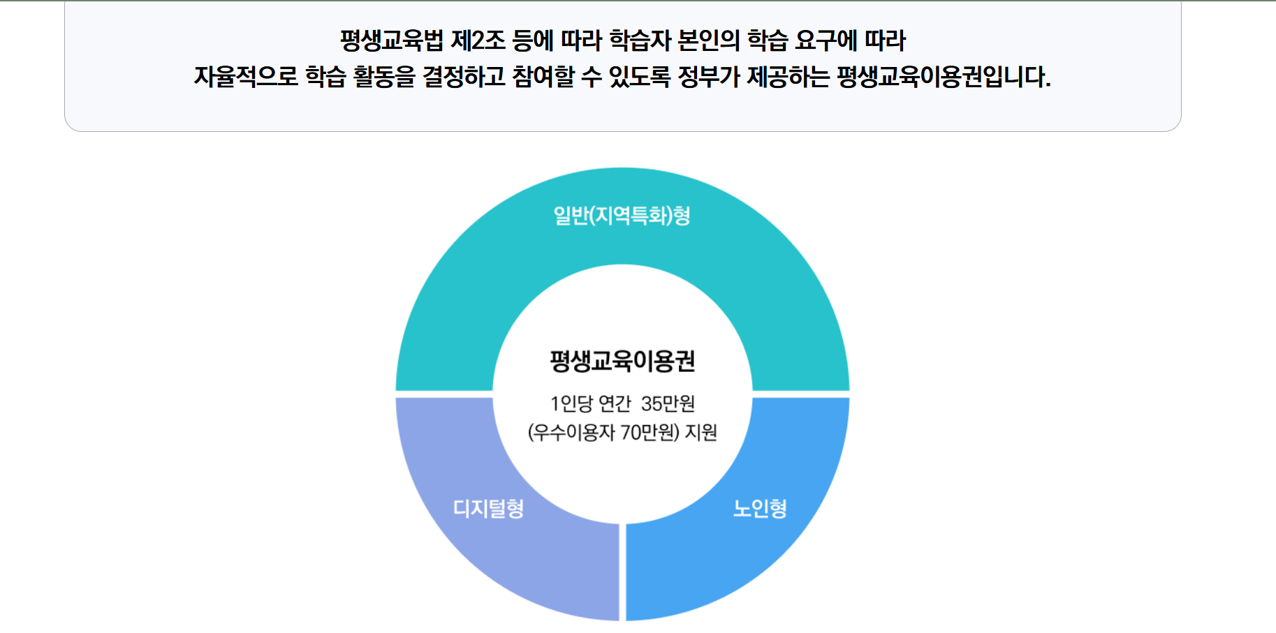 ‘평생교육이용권’은 저소득층, 장애인, 노인 등에게 자격증, 창업, 어학, 인문학, 디지털 교육 등 다양한 강좌를 수강할 수 있도록 교육비를 포인트로 지원하는 제도입니다.