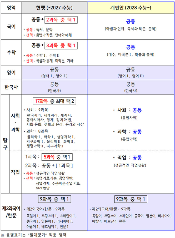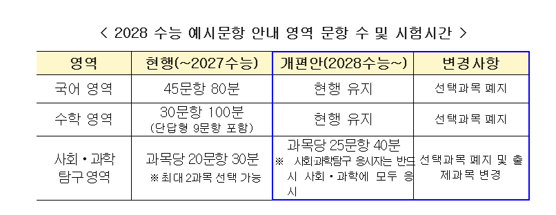 2028학년도 수능부터는 국어·수학·탐구 영역에서 선택과목이 사라지고, 모든 수험생이 동일한 과목을 시험 보게 됩니다.