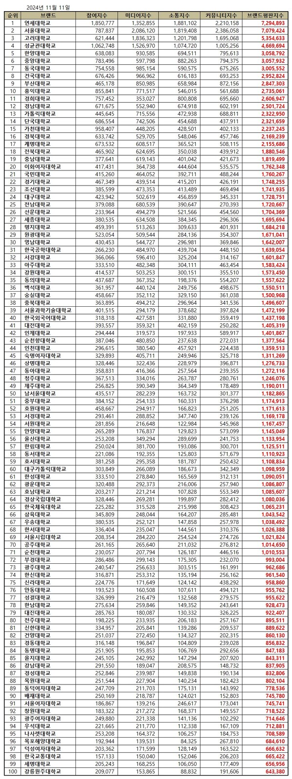 2024년 11월의 대학교 브랜드 평판 순위는 다음과 같아요.